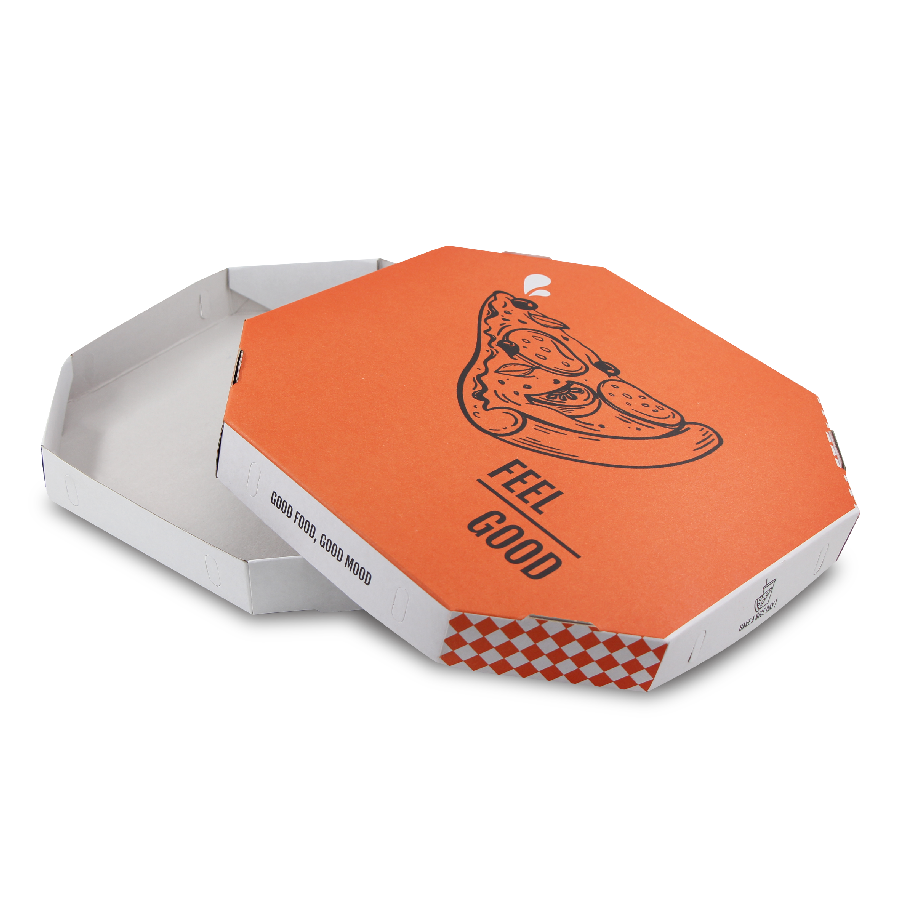 استفاده از مقوای مقاوم و بهداشتی، حفظ حرارت و استحکام بالا در حملونقل را تضمین میکند. طراحی هشتضلعی این جعبه، هماهنگی کامل با پیتزای برشخورده به ۸ قسمت دارد و تجربهای متفاوت و چشمنواز برای مشتری ایجاد میکند.